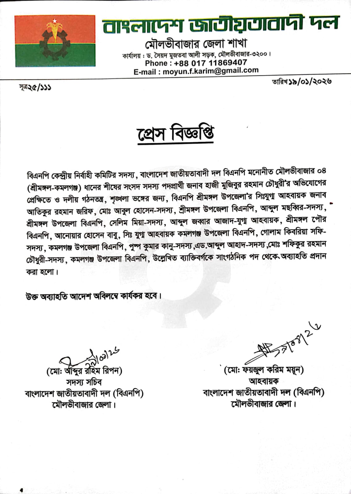 দলীয় শৃঙ্খলা ভঙ্গের অভিযোগে শ্রীমঙ্গল-কমলগঞ্জ বিএনপির ১১ নেতা অব্যাহতি